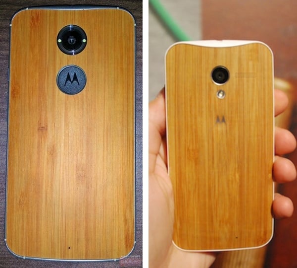 再看机身,熟悉的木纹背壳上面是后置摄像头和摩托罗拉的 LOGO。摄像头左右两个白点即是 Moto X+1 配备的双 LED 闪光灯,摩托罗拉 LOGO 看似磨砂质感的塑料“徽章”,相比 Moto X 区别还比较明显。