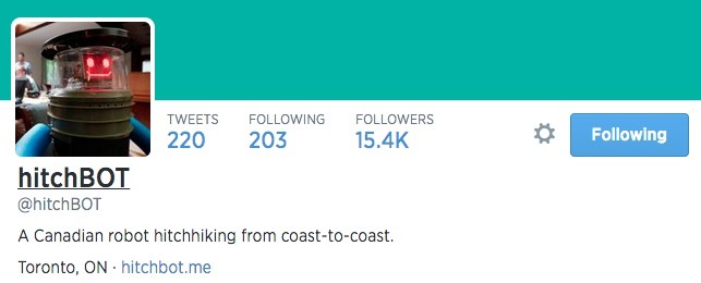 从 6 月初开通社交网络帐号以来,关注 hitchBOT 的人越变越多。Twitter 上,它拥有 1.54 万名追随者;在 Instagram 上,它拥有 5464 名追随者;而在 Facebook 页面上,也已经获得 18686 人关注。