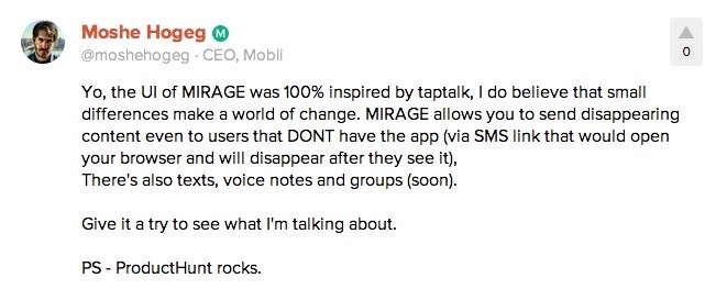 在发布 MIRAGE 应用后,CEO 摩西·霍格(Moshe Hogeg)发布了一个完整的说明,坦陈所有的 UI 灵感来自于 TapTalk:
