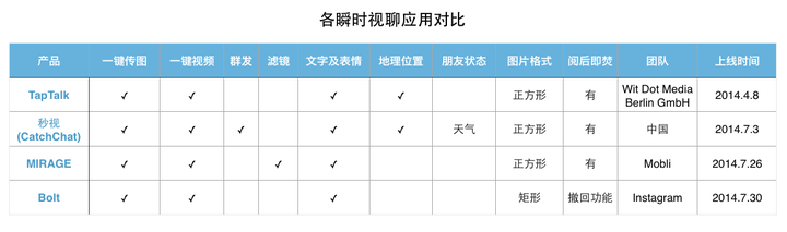 秒视、MIRAGE 及 BOLT 都是属于国外目前称谓的 TapTalk Style 应用。它们的最重要的特点,就是“一键完成”的交互创新——一键完成联系人指定,图片、视频的生成及发送。这种颠覆性的创新交互始于 TapTalk——该应用于 2014 年 4 月 初发布,属于阅后即焚应用,是一个地处柏林,远离硅谷团队的产品。这里,我们姑且定位它们为“瞬时视聊”应用。
