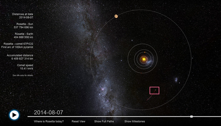 十年之后,格林威治时间 8 月 6 日 9 时 29 分(北京时间 17 时 29 分),罗塞塔号彗星探测器成功进入环绕 67P/楚留莫夫-格拉希门克彗星的轨道。虽然其他航天器也曾短暂接近过彗星,但罗塞塔号彗星探测器是首次进入彗星的近距离轨道,更令人鼓舞的是,该航天器还计划最大限度地接近彗星,并对其进行数月的仔细研究。