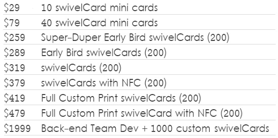 SwivelCard 在 Kickstarter 上发布不到 8 小时就达到了 1 万美元的筹款目标,截止目前其众筹金额已超过 46000 美元。不同版本的 SwivelCard 售价从 29 美元到 1999 美元不等。