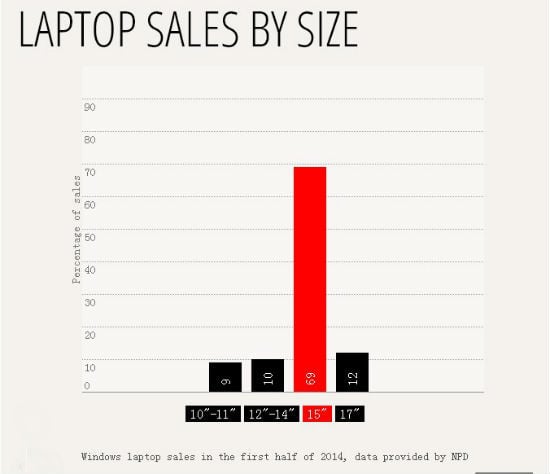 也许屏幕尺寸就是重点。那我们看看大屏笔记本在美国市场的表现如何。在 2014 年上半年, 15 英寸笔记本占据了笔记本市场的 69%,更大的 17 英寸的则占到了 12%。因此,市场上大部分 Win 8 笔记本都以大显示屏作为主打,在百思买和沃尔玛,超过 50 款以上的 Win 8 笔记本,配备 15 英寸或以上的显示屏,价格均在 500 美元以下。