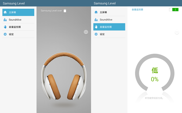 不过既然是三星的机型,理应会和三星手机平板形成更好的联动,事实也是如此,三星特意开发了一款 Samsang Level 应用,优化对 Level 耳机产品的使用。比如显示了耳机电池的电量,不过并非以百分比显示,经过了约 6 个小时的不间断播放,这个界面示意消耗了约五分之一的电量。另外还有一个比较贴心的音量监控器功能,可以显示听觉疲劳程度,如果是在较小音量下听音乐的话,这个计量表的增长非常缓慢。