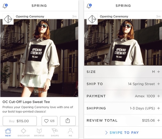 Spring 没有购物车、也不用什么第三方支付,只需将一个“购买”按钮从左滑到右,就可以在家坐等收货了。当然,在首次购物时你需要将穿衣尺码、信用卡信息和送货地址等上传到 Spring 账户,之后买衣服什么的,也就只是一瞬间的事。