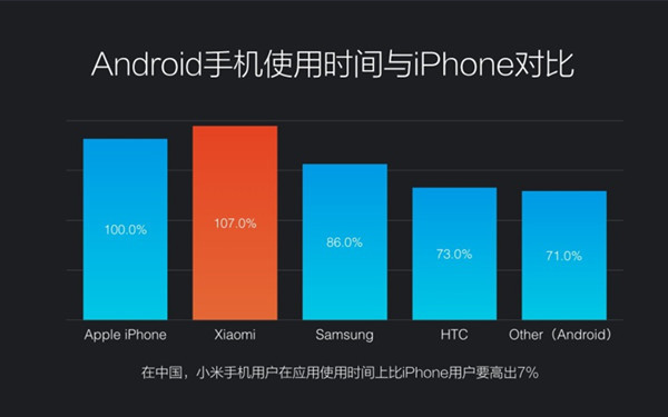在发布会上,小米副总洪锋称,从 10 年 8 月诞生,到 12 年12 月用户首次突破 1000 万,MIUI 用时 849 天。而从 6000 万到现在的 7000 万用户(联网激活用户)的跨越仅耗时 48 天。并且在使用时长上,小米手机用户也是优于 iPhone 等对手。不仅是国内遍地开花,目前 MIUI 已经有了 28 个语言版本,26 个国际粉丝站。