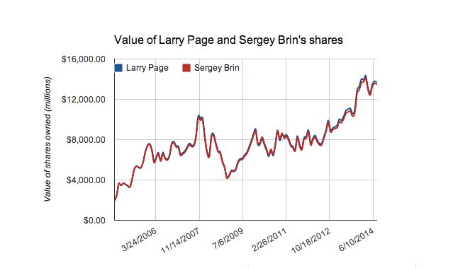 10 年前,Google 的上市发行价只有 85 美元,Larry Page 和 Sergey Brin 所持股票总值 65 亿美元,如今已经增长到了 271 亿美元。
