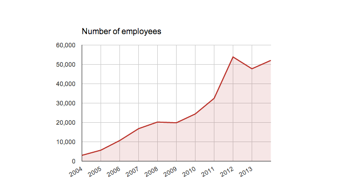 随着收入增长,Google 上市以来多招用了近 5 万个新员工。2004 年,Google 共有员工 3021 名,至今已有 52069 名。
