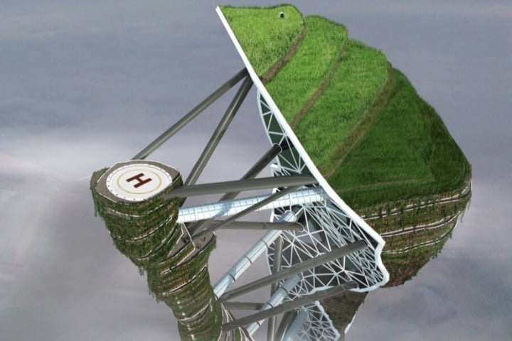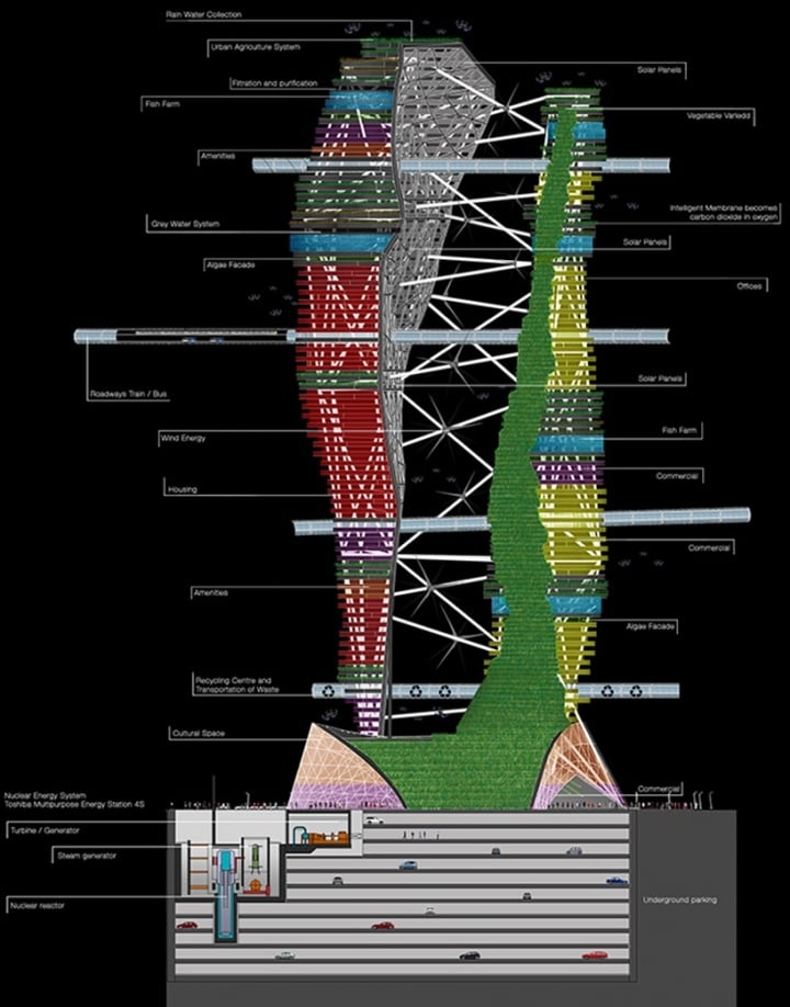 Cachoua Torres Camilletti 设计师们认为自己的设计代表了一种方向,在摩天大楼里塞下一座小城市,因为它能很好的解决现在城市所面临的交通拥挤、环境污染、粮食危机、地价暴涨、能源危机等一系列的问题。