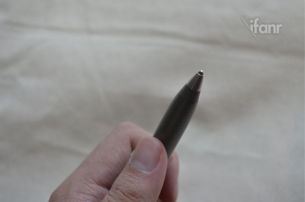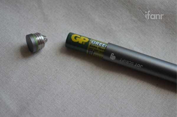 笔身的材料分别有不锈钢、铝、塑胶。尾端有一个笔盖,打开可以放置一节 7 号电池。笔尖采用的是热塑性聚酯,使用时会有轻微的反弹,感觉不错。