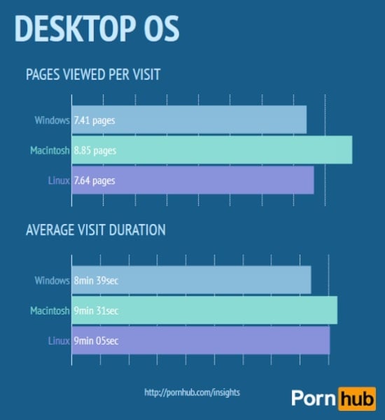如上图,Mac 用户似乎是注意力最集中的那一类,他们在 Pornhub 上停留的时间最长,浏览的内同也最多。Windows 用户和 Linux 用户就基本上差不多了。