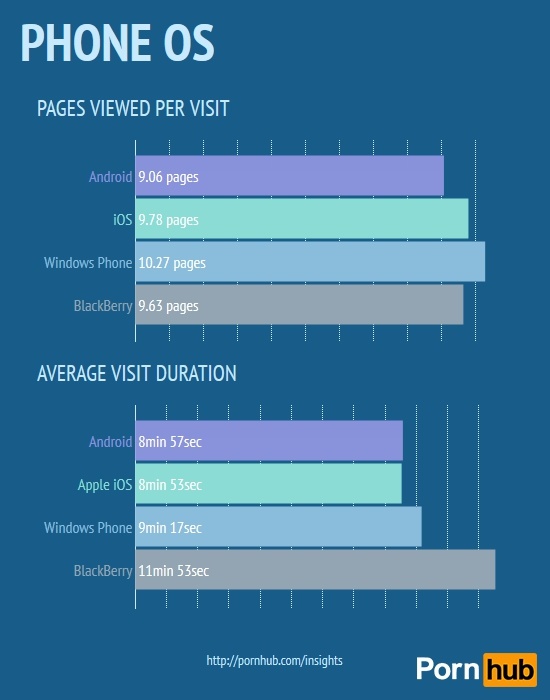 从去年开始,Pornhub 的一项统计结果就曾指出,美国多数的色情浏览发生在移动设备上,其中智能手机占据了主要地位。那不同系统的用户在智能手机上,又是如何表现的呢?