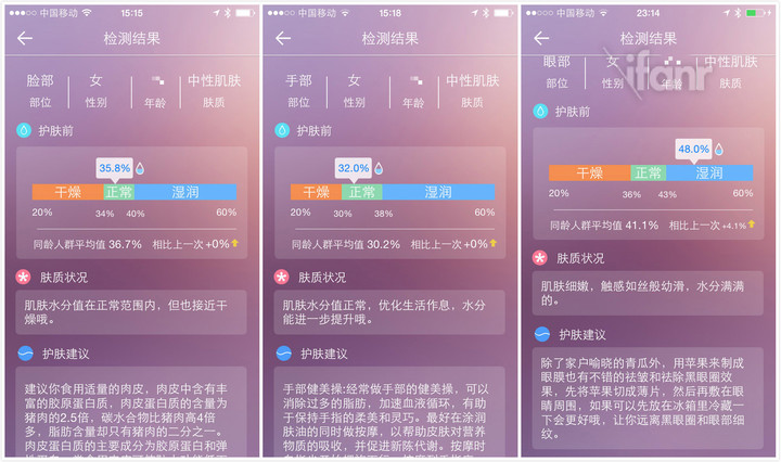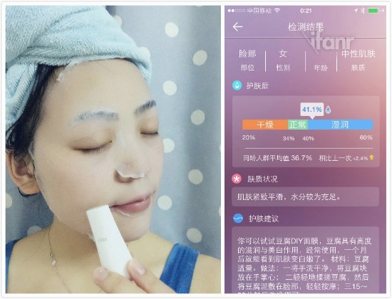 检测完成后点击检测结果,就能看到具体的肤质信息,分别为干燥、正常和湿润三个水平。在界面底部还提供了“护肤建议”一栏。很赞的一点是,它不是推荐各品牌的化妆品,而是一些食补建议或者自制面膜之类的信息。如果你坚持使用,还可以在历史记录那一栏看到一周甚至一个月的皮肤变化状况。
