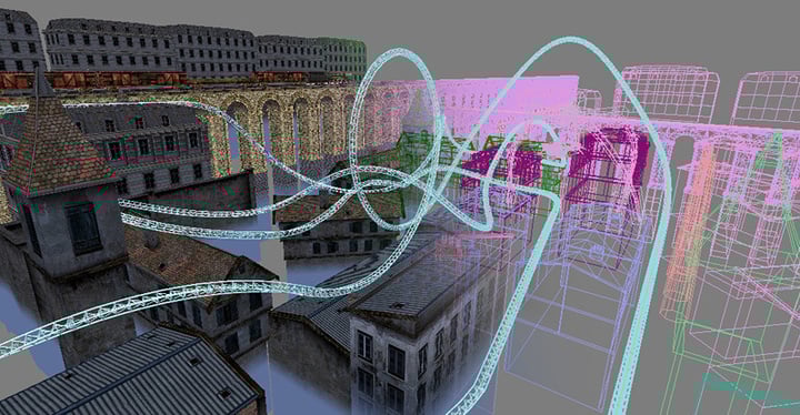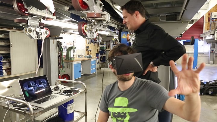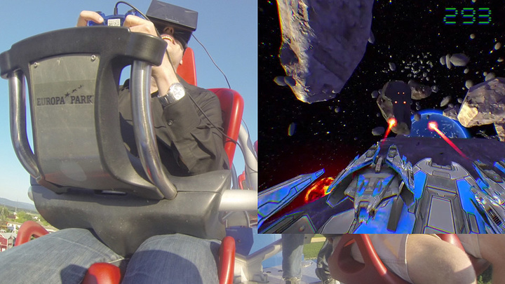 项目中,Thomas Wagner 首先在 Oculus Rift 头戴式显示器平台上,开发了一系列过山车形式的乘骑游戏。项目体验者们在乘坐过山车时,会事先带上头戴式显示器。过程中,安装在过山车车轮上的传感器能够将实际车速与虚拟环境同步,而安装在设备上的位置追踪器,也能够让体验者们体验到真实过山车的急转弯以及“螺旋钻”等环节。