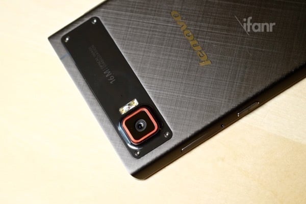 作为装饰,联想在 K920 摄像头加上一圈点缀用的红色,由此得名 “火疖子” ,是否好看则见仁见智了。另外,在摄像头周围加上了一块亚克力材质作为修饰,低调标注 “16MP + OIS”。而亚克力上外露的四颗粗犷的螺丝,除了突出 K920 的阳刚气质外,还可以视为对 K900 设计的致敬(这也是 K910 所缺少的关键元素,相比之下 K920 才是 K900 的真正继承机种)。