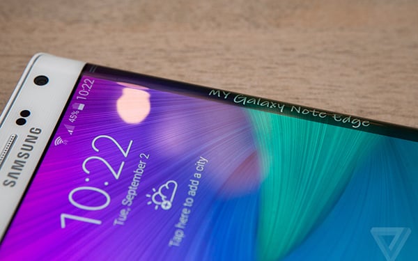 随后发布的一款新品手机是 Note Edge,该手机最大的亮点是曲面侧屏。侧屏可快速获取通知,可滑动,还可变成尺子,计时器,独立壁纸。也可以用来显示拍照的工具栏,亦有特制的 FLIP Wallet 保护套。三星也为开发者开放了曲面侧屏的 SDK,未来开发者可以为这个特性开发应用。