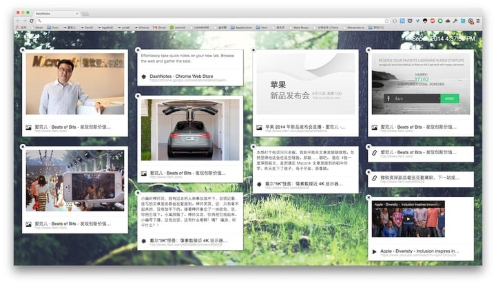 当你想查看 DashNotes 时,只需打开一个 Chrome 新标签页即可看到。所有内容都整齐地平铺在一张漂亮的壁纸(DashNotes 有一套漂亮的壁纸库随机更换)上,你可以复制文字、保存图片以及直接观看视频,此外你也可以点击左上角的 + 号立即添加文字笔记。