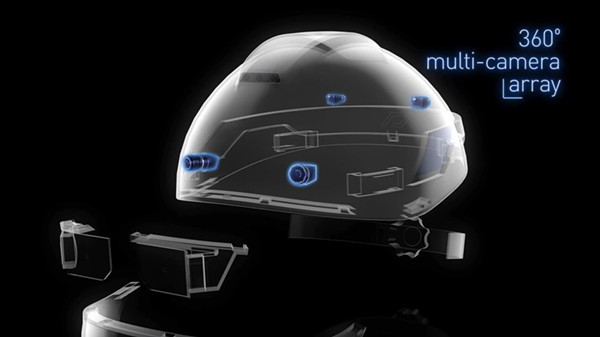 Daqri 出品的这款头盔看起来就像是一顶融入和时尚和科技元素的安全帽,不过即便如此,我相信没多少人愿意戴着它出街。好在 Daqri 智能头盔本身就是给工人做的,它的主体还是一个大大的安全帽,前面是类似摩托车头盔的护目面罩,其实最主要的还是面罩后方两款玻璃显示器,用来显示增强现实信息。同时头盔还配有摄像头阵列,可以在显示器上提供 360 度的视角,全面掌握周围环境。