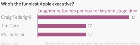今年 6 月 117 分钟的开发者大会上,5000 名现场观众一共大笑了 50 次,鼓掌 100 次。一般情况下,调侃微软和 Google,或者苹果的其他高管会引起大家发笑。不过统计发现,在苹果大会上最会“搞笑”的人不是 Tim Cook,而是苹果软件技术高级副总裁 Craig Federighi,这也许跟他上台的时间最多有点关系。