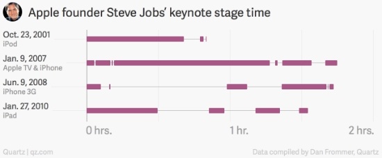 Quartz 研究发现, 苹果在 iTunes Store 中列出了从乔布斯宣布第一代 iPhone 起至今,共 27 场发布会的视频,平均每场演讲时长 88 分钟。而 2007 年 iPhone 发布会的时候,乔布斯一个人就在台上说了 90 多分钟,中间仅邀请了时任 Google CEO,后来成为苹果董事会成员的 Eric Schmidt 上台讲几句。不过后来,乔布斯慢慢开始给其他苹果高管更多上台时间。