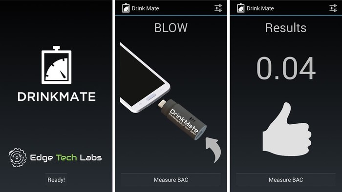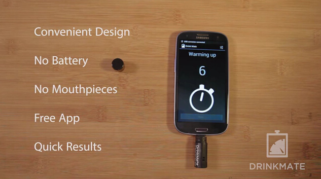 DrinkMate 十分简单易用,用户只需将其与自己的 Android 手机相连后静候 7 秒,然后配合相应的 App,对其半导体传感器呼气,就在 App 上查看自身血液酒精含量。