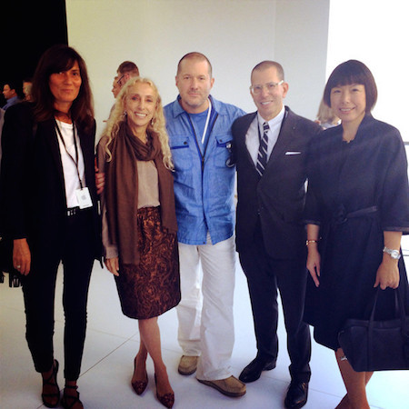 康泰纳仕国际集团主席兼 CEO Jonathan Newhouse(右二)带领 VOGUE 团队,包括《VOGUE 服饰与美容》杂志编辑总监Angelica Cheung 张宇(右一)、意大利版《VOGUE》主编Franca Sozzani(左二)、法国版《VOGUE》主编Emmanuele Alt(左一)与苹果高级设计副总裁 Jonny Ive(中)在发布会现场。