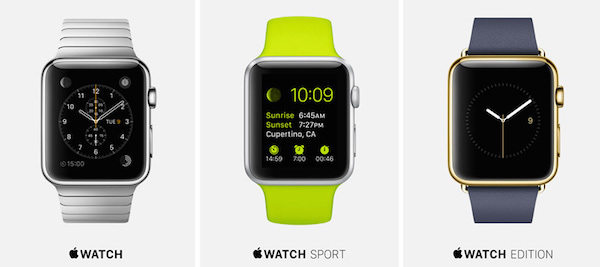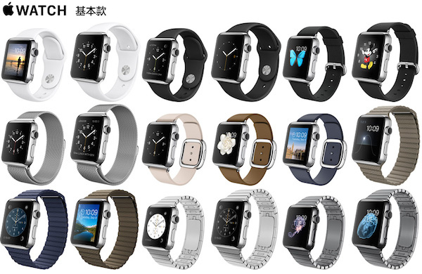 苹果此次一口气为 Apple Watch 推出了34种款型,创下苹果单一产品最多花色的历史之最。以花色繁多著称的 iPod 家族都望尘莫及。总结起来,一共是:3大系列(基本、运动、奢华),6种表壳材质,18款表带,2种表盘尺寸,11种时钟界面。