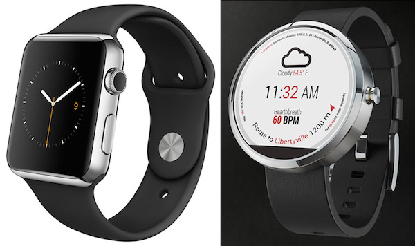 许多人会拿 Apple Watch 和安卓智能手表阵营的当家花旦 MOTO 360 作比较。最显著的区别莫过于 MOTO 360 采用了智能手表中较为少见,但更接近传统手表的圆形表盘,而 Apple Watch 则保守地选择了长方形。机身按键也没有 MOTO 360 单纯简洁,采用了双按键设计。