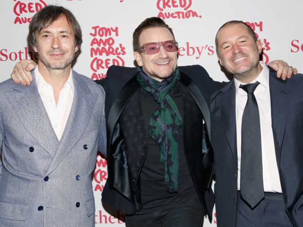 图为(从左至右)Marc Newson、U2 乐队主唱 Bono、Jonny Ive 一起出席(RED)慈善拍卖