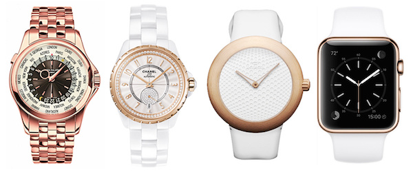 图为四款不同风格的 18K 玫瑰金腕表:(从左至右)百达翡丽、香奈儿、IKEPOD、Apple Watch