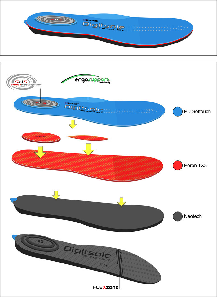 Digitsole 的材料同样出众,它基垫由 NEOTECH 生产,采用 Digitsole 工程师特别设计的超轻共振材质。在基垫上一层配有减震性能极佳的 Poron TX3 材质。最上层是一种导热性超好的超细纤维的 PU Softouch。