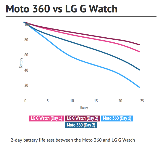 除了 Apple Watch,Android Wear 阵营的 Moto 360 和 LG G Watch 同样备受关注,近日 PHANDROID 对这两款手表的续航能力进行了测试,结果发现二者大同小异,同样是只能续航一天。