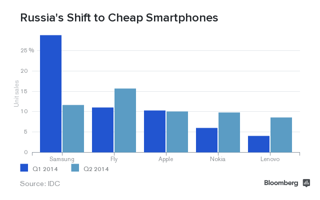 从上图可以看出,在俄罗斯的智能手机市场,不仅是苹果公司的销售额下降,三星的销售额也比上个季度下跌超过半成。而低价 Android 手机的制造商 Fly 则逆转三星爬到了第一位,Nokia 也在紧紧咬着苹果,争夺第三位的位置。