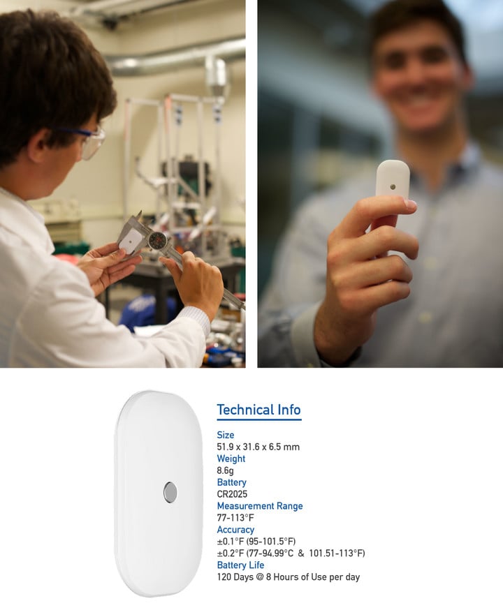 他们设计了一款名为 Fever Smart 智能体温检测器,它的尺寸仅为 51.9×31.6×6.5mm,约两枚硬币大小,重量仅为 8.6 克,采用 CR2025 电池,在每天保持 8 小时使用的前提下可以坚持 120 天,检测温度范围在 25°C 到 45°C 之间,制造材料经过美国食品药品监督管理局检验对身体无害。