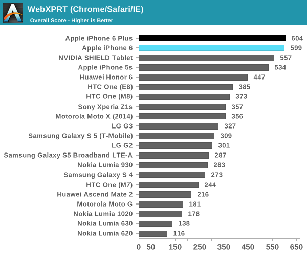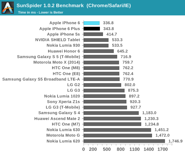 和 ifixit 在拆机界的地位一样,Anandtech 在跑分界也是首屈一指的存在,这一次落到他们手上的机器就是刚出不久的 iPhone 6 和 6 Plus。Anandtech 这次测试了一些基础的性能数据,包括浏览器 Benchmarks,游戏 Benchmarks,以及标准网页浏览续航测试。