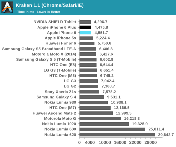 另一个值得注意的是,从跑分来看,其实 A7 和 A8 处理器的性能差距十分之小。在 SunSpider 中,A8 领先 A7 分数值为 13%;而在 Kraken 中,领先幅度仅有 7.5%,总体来看,A8 之于 A7 的进步并不像 A7 之于 A6 那样的大跃进。Anandtech 表示,两者性能差异较小,指向的是两者采用了相似的底层架构。