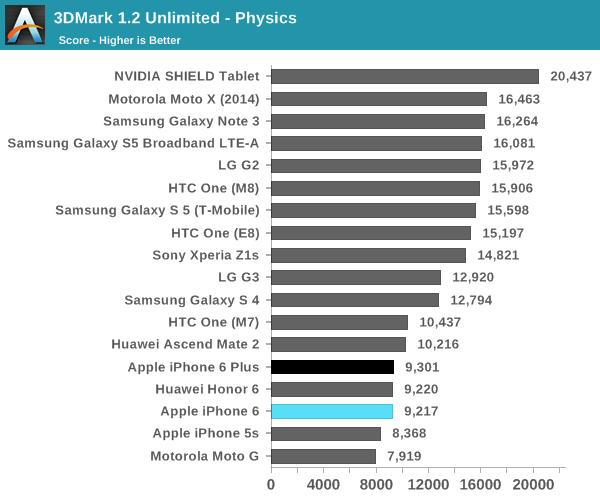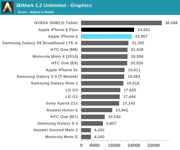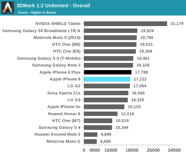 如果说 iPhone 6 和 6 Plus 的 CPU 性能让人满意的话,那么 GPU 性能就难以称雄了。这里 Anandtech 采用 3D Mark 来进行测试。