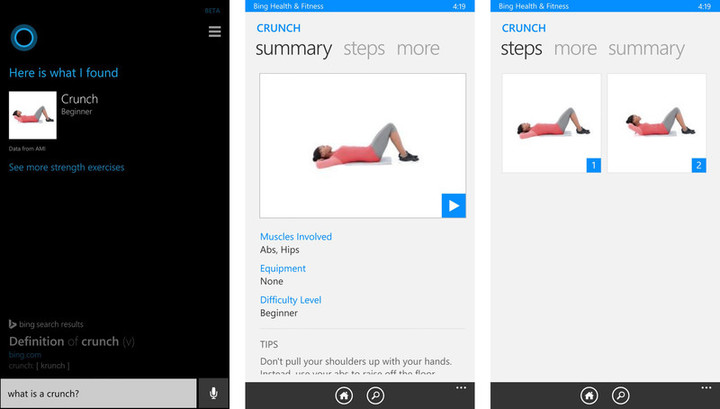 在新的 WP 8.1 中,原生就添加了一个“健康”的应用,提供相关的资讯聚合。这一次 Cortana 允许用户问询更多关于健康和健身方面的问题,并提供相应的指导。在和应用的联动上的一个例子是,用户可以询问“Facebook, what’s up with Todd?”来知晓 Todd 在 Facebook 上的动态。