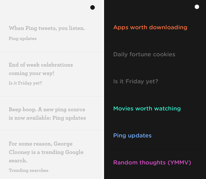 目前 Ping 上只提供八个话题分类,背景色也只有黑白两种,一面是内容,一面是话题。但毫无疑问 Ping 是非常神秘的一款应用,首先我们不清楚这些分类是基于什么原则而决定的,而且也不知道这些推送的内容是哪里提供的。