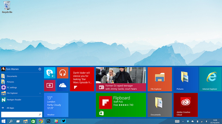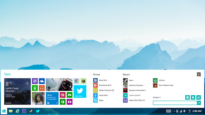 从下面几组图片我们也可以看出 Jay Machalani 在开始菜单上的设计与 Windows 10 中的设计相差并不大,它们都是采用了自动适屏的水平滚动菜单设计,当应用程序过多时开始菜单就会自适应屏幕,让用户在一个横条幅中滚动查看应用程序。
