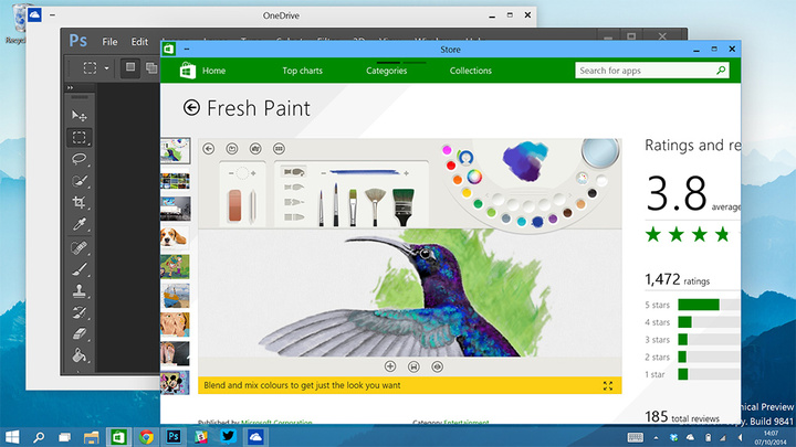 除此之外 Windows 10 中将 Modern 应用窗口化的设计与 Jay Machalani 的设计也刚好相同,他们都在 Modern 应用的右上角加入了传统应用中最大化和关闭窗口的标记,这样一来使 Modern 应用成为和传统 Windows 应用一样的窗口程序。而此前在 Windows 8 上,Modern 应用在使用中是全屏的。