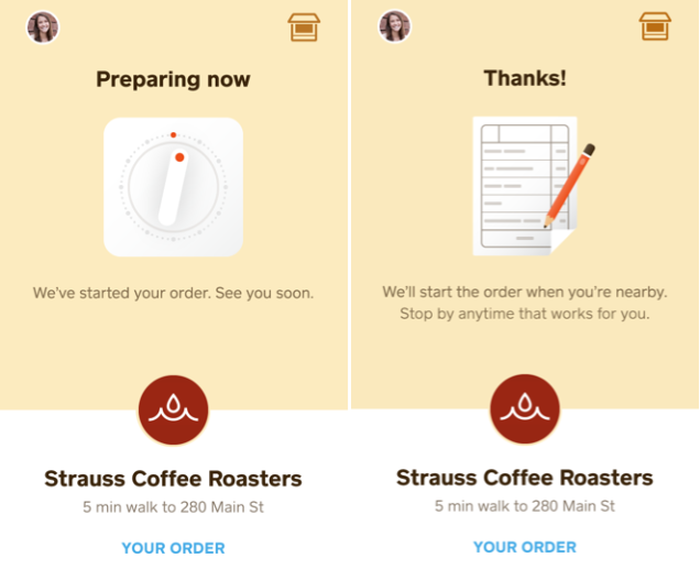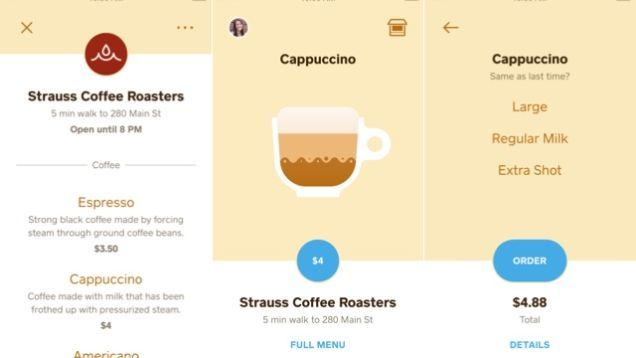 比如,你在出门前点了一杯摩卡,加全脂牛奶和鲜奶油,app 会显示它的制作时间是 3 分钟。OK,你出门了,当 app 计算出你“还有 3 分钟到达”时,店家就会收到通知,如果这时开始制作咖啡,你又刚好在 3 分钟时进门,你的咖啡就已经为你准备好了。