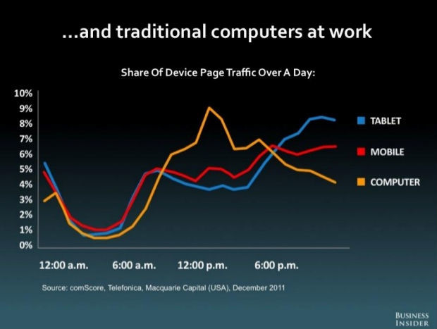 这也与之前 Business Insider 的报告十分相同,从下图的电脑使用曲线可以看出,PC 主要是作为一种工作工具而出现的,它与平板电脑的使用场景截然不同,PC 有自己的应用场景,所以当人们发现平板无法满足自身需求时必然会回到 PC,所以 PC 的回暖也就不足为奇了。