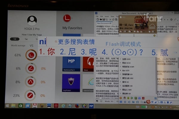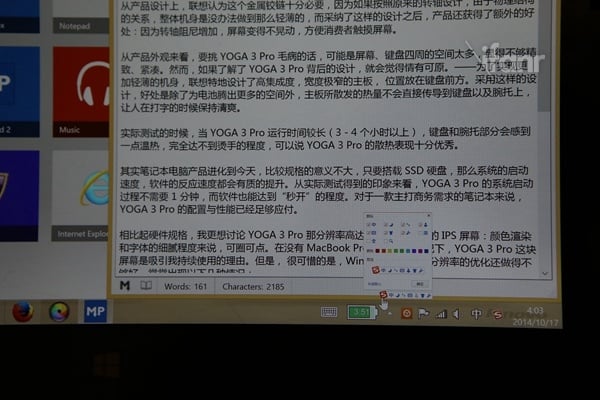 相比起硬件规格,我更想讨论 YOGA 3 Pro 那分辨率高达 3200 x 1800 的 IPS 屏幕:颜色渲染和字体的细腻程度来说,可圈可点。在没有 MacBook Pro Retina 的情况下,YOGA 3 Pro 这块屏幕是吸引我持续使用的理由。但是, 很可惜的是,Windows 8.1 对高分辨率的优化还做得不够好,常常出现以下几种情况: