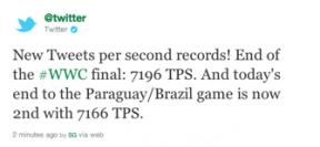 在北美一向不受待见的足球运动昨天在 Twitter 上着实火爆了一把。据 Twitter 方面给出的数据,在昨晚美国女足和日本女足的世界杯决赛中,平均每秒有 7196 条 tweets 发出。巴拉圭和巴西之间的比赛也不含糊,TPS 为 7166。于是,TPS (tweets per second)成了衡量一个事件热度的重要指标。