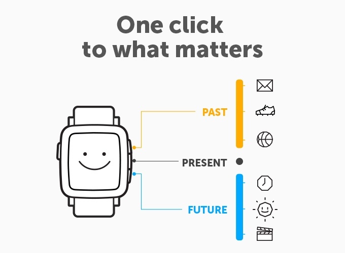 除了硬件上的强化,Pebble Time 还宣布将采用全新的 Timeline 操作界面。简单来说,Timeline 将不易在手表上操作的繁琐功能简化成一条线性的功能表,所有通知、新闻、待办事项,都按照时间排序排布在同一条时间轴上。