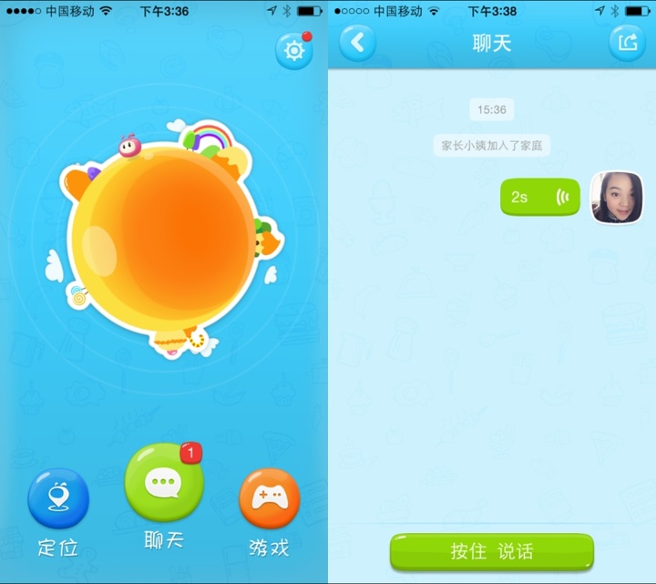聊天,主界面中间的选项是聊天功能。糖猫的聊天方式与微信的语音功能类似,对着手机发送语音后,孩子只需按动手表侧面的按钮就能听到家长的讲话。反过来,孩子也能对着手表讲话,按下按钮,语音也会发送到家长手机上。