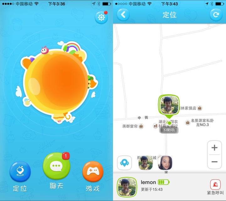 首先是定位,开启定位界面,会有一张电子地图展现在用户面前,同时显示家长和小孩的头像以及各自所在的地理位置。家长可以用手机随时了解孩子在哪里。