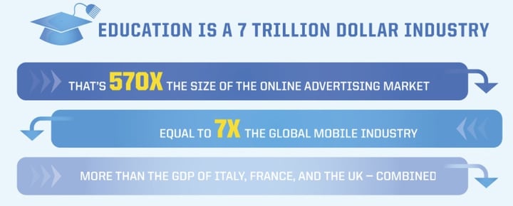根据 Knewton 估算,教育产业价值 7 万亿,7 倍于全球移动工业产值,高于意大利、法国及英国 GDP 总和。在这中间,互联网有大把机遇。