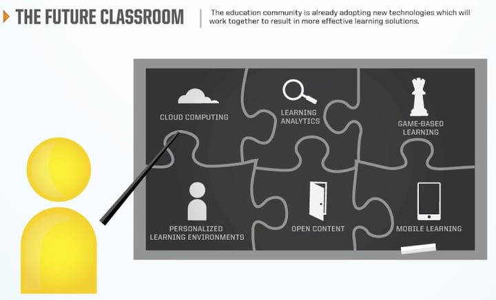 未来教室也许会用到云计算、学习分析软件、个性化学习环境、开放式内容以及便携式移动教学环境。